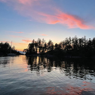 Very high winds up the Strait of Georgia prevented us from continuing up towards the Welcome Passage as we’d planned today, so instead we headed farther inland to Gambier Island and found a beautiful anchorage in Center Bay, Sunset Wall – aptly named as the sunset views were amazing. A note about this anchorage and the neighboring Sunset Cove: a very hard granite bottom shelf makes anchoring very difficult, and both require stern ties due to the tight squeezes! My first experience with a stern tie turned out to be very challenging, having to simultaneously position the boat close enough to the shore, pointed in the right direction, and paddleboard the stern tie to shore is no small feat! That task made us all want to go swimming, and here the water was miraculously warm – 66 degrees F! – so we promptly jumped in.
