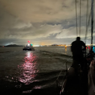 We were told our preliminary time to meet our advisor was 0430, out at buoy 4 near the entrance to the canal, but we needed to call Canal Control on the VHF in the morning to coordinate the final time. As we circled near the buoy in the dark, Nick spotted bright lights coming at us. We slowed and straightened to allow our advisor, Guillermo, to leap aboard. It was really happening!